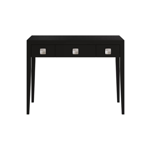Di DesignsThree drawer black console table in birch wood and mdf, tapered legs, wooden runners on drawers and square chrome style handles (require attaching)...
