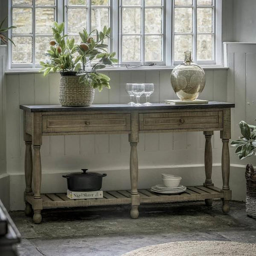 Gallery DirectIn stockThis lovely console offers practicality, combined with a stylish sophisticated yet rustic look, with its marble top, two drawers and large shelf. I...