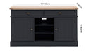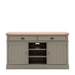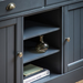 Ideal for the kitchens or dining areas, this sideboard offers practical storage with 2 drawers and 2 cupboards with adjustable shelves plus additional shelves in-between, the perfect spot for cookbooks. The hand painted subtly textured grooved doors, metal handles and grooved & planked oak top create a modern country feel perfectly suited to both rustic and contemporary interiors.