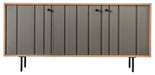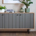The Grenola furniture collection features a fusion of Japanese minimalism and Scandi style to create these beautiful contemporary Japandi design pieces. Natural oak has been paired with mid-grey painted, with routing to create a relief design adding detail to the doors. The Grenola 3 Door Sideboard combines the stylish design of the Grenola range with practical storage space. As well as the large cupboard area, there is an internal drawer within the sideboard which is ideal for smaller items. Slim black metal legs and handles add the finishing touch.