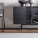 This stunning sideboard offers a striking contemporary look, with the slatted design on the doors adding interest. Crafted using solid oak for the slats and oak veneers, the matt black finish beautifully shows the grain of the wood and pairs perfectly with the matt black metal legs. A matt black solid oak handle add the finishing touch. Internally, each cupboard has a shelf for added practicality. The shelf in the central section is fixed. The unit is part of a collection which offers a selection of cabinets. The collection is part of our Packed-Flat Design Project, offering easy delivery to any room in any property, whilst reducing the packaging needed. Easy assembly is required, but all the tools needed are supplied.
