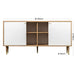 This lovely sideboard makes an unusual eye-catching feature piece, with a combination of a painted finish and natural oak veneer. The unit combines colour and shape to great effect, with a routed geometric circular pattern, reminiscent of Bauhaus design, on the painted doors. Brass handles on the cupboard door are complemented by brass 'socks' on the solid oak legs. The unit is also available in grey, and there are matching and coordinating pieces. The collection of living furniture is part of our Packed-Flat Design Project, offering easy delivery to any room in any property, whilst reducing the packaging needed. Easy assembly is required, but all the tools needed are supplied.