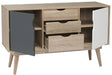 Completing an affordable, retro range of furniture, the Scandi 3 Drawer Oak Sideboard features angled legs and a large table surface inlaid with 2 cupboards and 3 drawer combination for storage. Finished in oak, with accent white and grey doors, this design is ideal for those looking for unique style, practical storage options and something a bit more adventurous from living area.