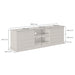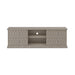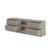 Four drawer TV/media unit in grey aged oak and oak veneer, raised patterned front on drawers, drawers on wooden runners, drawers painted black on insides, metal finish octagonal handles