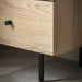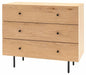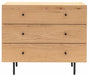 Offering a lovely contemporary look, this practical chest of drawers is crafted using oak veneers paired with a black metal underframe and drawer handles. The natural wood veneer, with its unique random knots, has been selected to give a modern rustic style. Matching pieces available.