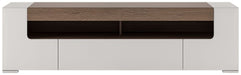 Toronto 190 cm wide TV Cabinet. Extra wide 190 cm low TV cabinet wide enough for any modern TV, has openings for satellite accessories, and plenty of storage behind soft close doors.  White high gloss fronts with Sanremo oak inset Laminated board (resistant to damage and scratches, moisture and high temperature) Modern handle free solution Soft close drawer runners  Soft close door hinges Adjustable hinges on all doors Easy self assembly