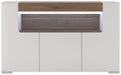 Toronto 3 Door Sideboard with open shelving (inc. Plexi Lighting). This 3 door sideboard has many features including soft close doors. internal LED lighting and adjustable shelves. White high gloss fronts with Sanremo oak inset Inc. plexi lighting Laminated board (resistant to damage and scratches, moisture and high temperature) Modern handle free solution Soft close door hinges Adjustable hinges on all doors Easy self assembly