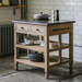 Offering an updated classic look, this lovely kitchen island combines style and practicality, with its marble top and two drawers and two shelves for storage. It is crafted from North American pine solids and veneers where practical, with the clever use of a mill saw giving characteristic features of cross sawn timber to create a tactile, dramatic finish. Matching pieces are available.
