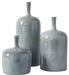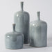 A set of three stylish vases in a soft, mottled, blue finish with a tapered neck.