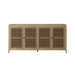 Four door sideboard, grey aged oak and oak veneer, rattan latticed front, painted grey on inside, tapered legs, small round gun metal style handles